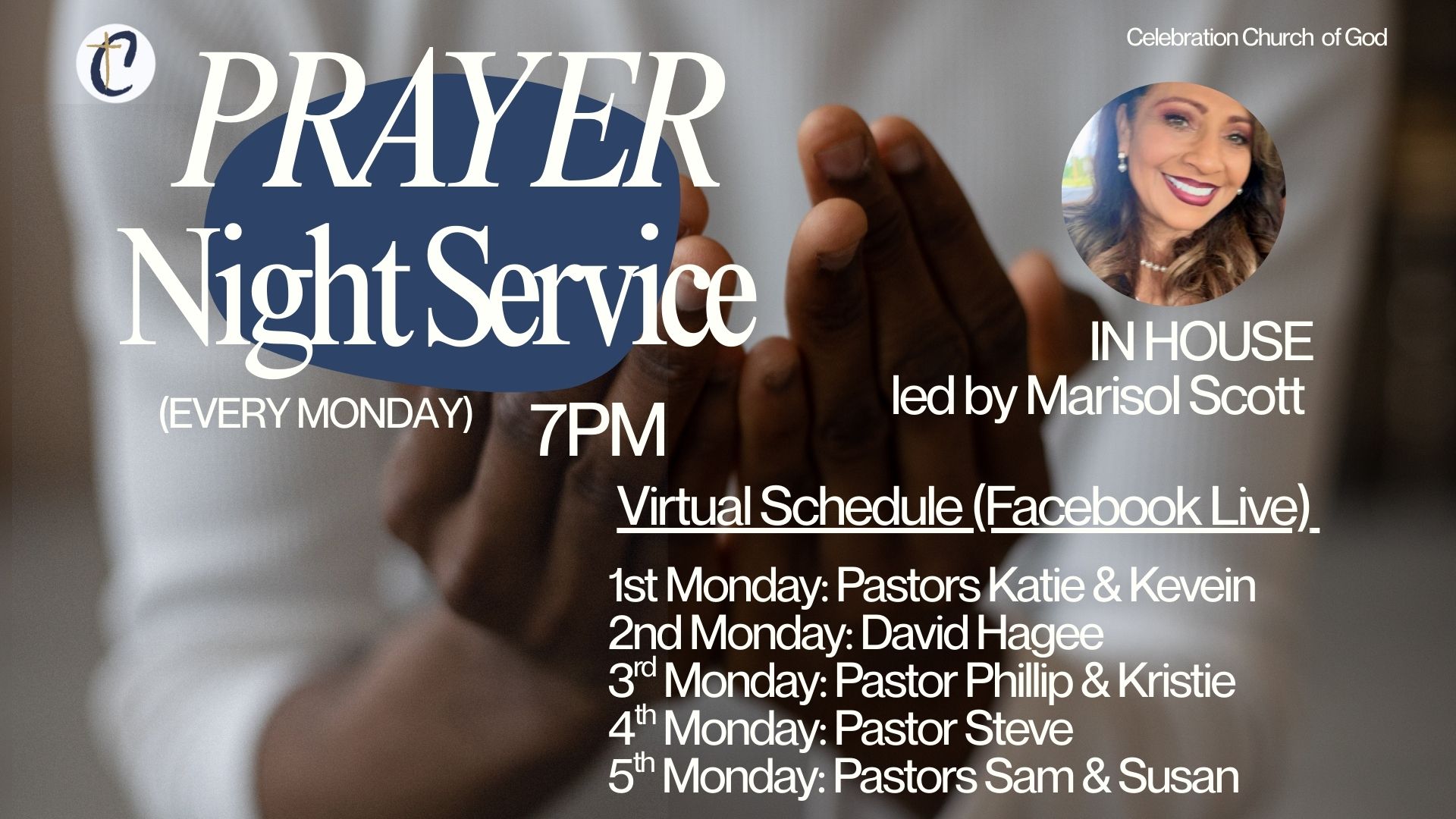 Every Monday Night at 7:00 pm Marisol Scott will lead a time of prayer in the Sanctuary. If you are unable to come to the church, there will be someone on Facebook live to pray with you. See the schedule on the slide.