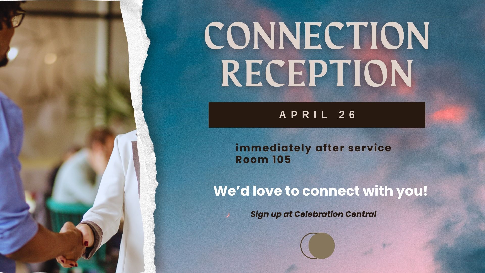 New to Celebration??? Join us for our Connection Reception, Sunday April 26 immediately following the service in room 105. Meet the staff and help us get to know you better.
