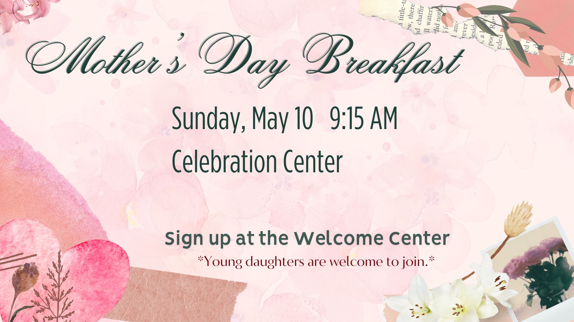 Our annual Mother’s Day Breakfast will be Sunday May 10 at 9:15 in the fellowship hall upstairs. All ladies are invited, bring your daughters. It will be a great time of fun and fellowship.